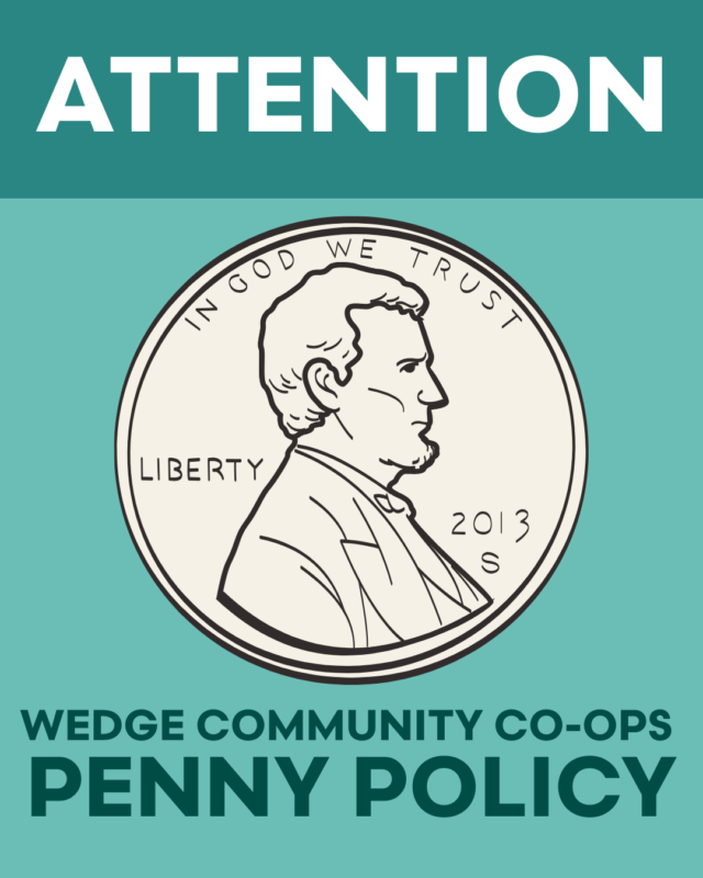 Starting Wednesday, January 21, Wedge Co-ops will stop giving out pennies as change. If you pay with cash, your change will be rounded to the nearest nickel in your favor.
