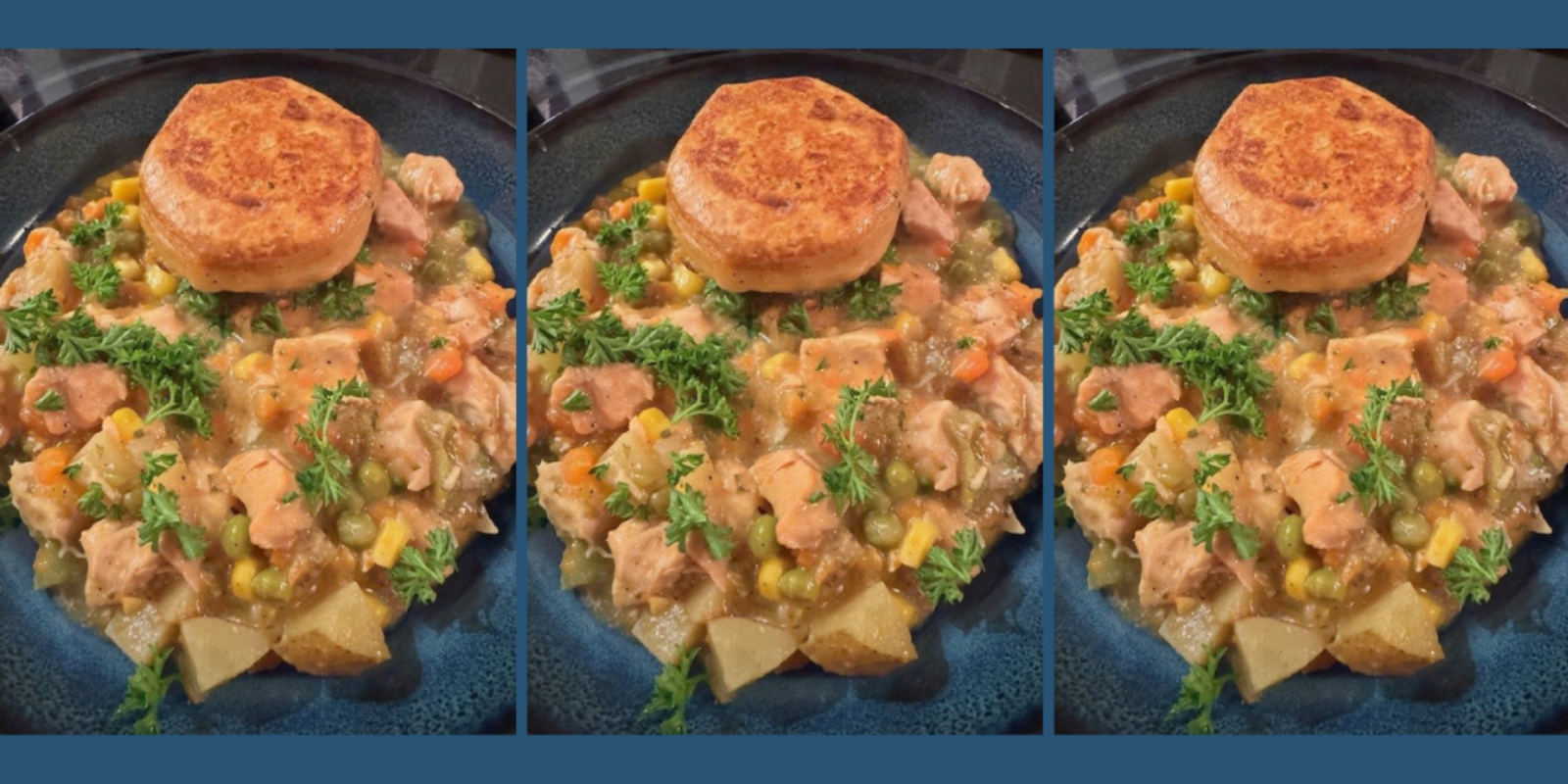 5. Serve chicken pot pie in a wide bowl, add optional freshly chopped parsley, top with a biscuit or two, and enjoy!